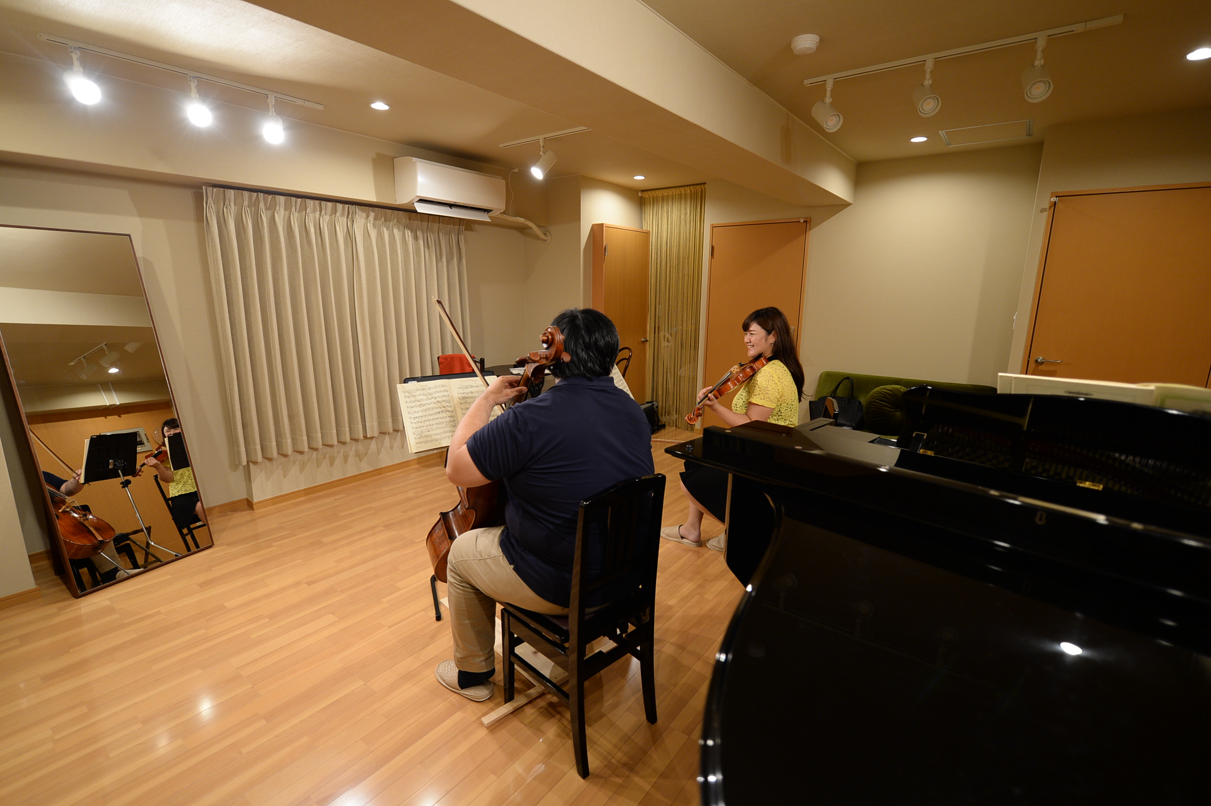 スタジオ内 グランドピアノ常設 スタジオ内 姿見もあります。 スタジオ内 座り心地抜群のソファ、カーテンの向こうは流し台です。 ピアノ練習風景 ピアノの練習でご利用いただきました。 チェロアンサンブル風景 チェロアンサンブルでご利用いただきました。 声楽合わせ風景 声楽の合わせでご利用いただきました。 声楽レッスン風景 声楽レッスンでご利用いただきました。